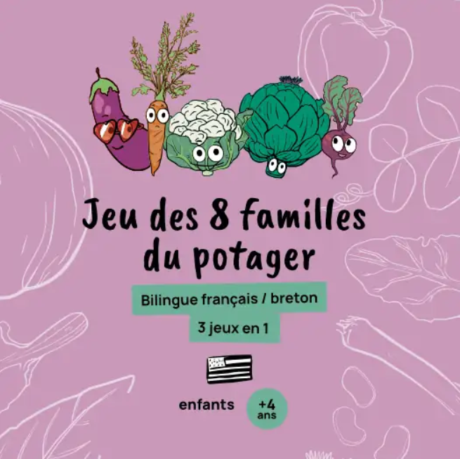 Le jeu des 8 familles est bilingue français/breton. Il permet d'apprendre les noms des légumes et des familles botaniques tout en s'amusant ! C'est en fait 48 cartes, 3 jeux en 1 : jeu de 7 familles, mémory et qui est-ce. Il est imprimé en Bretagne. Dès le 10 décembre dans votre boîte aux lettres !