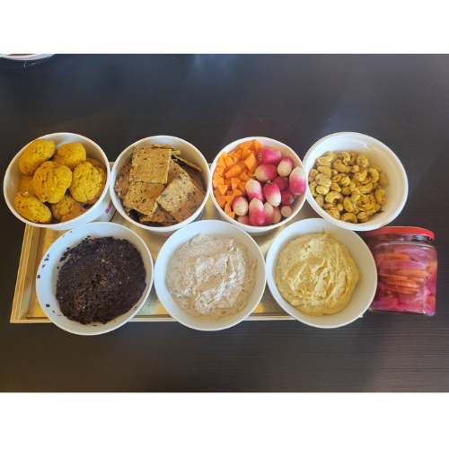 - Des plateaux apéros healthy avec des tartinades, crackers, pickles, crudités et oléagineux rôtis aux herbes et épices