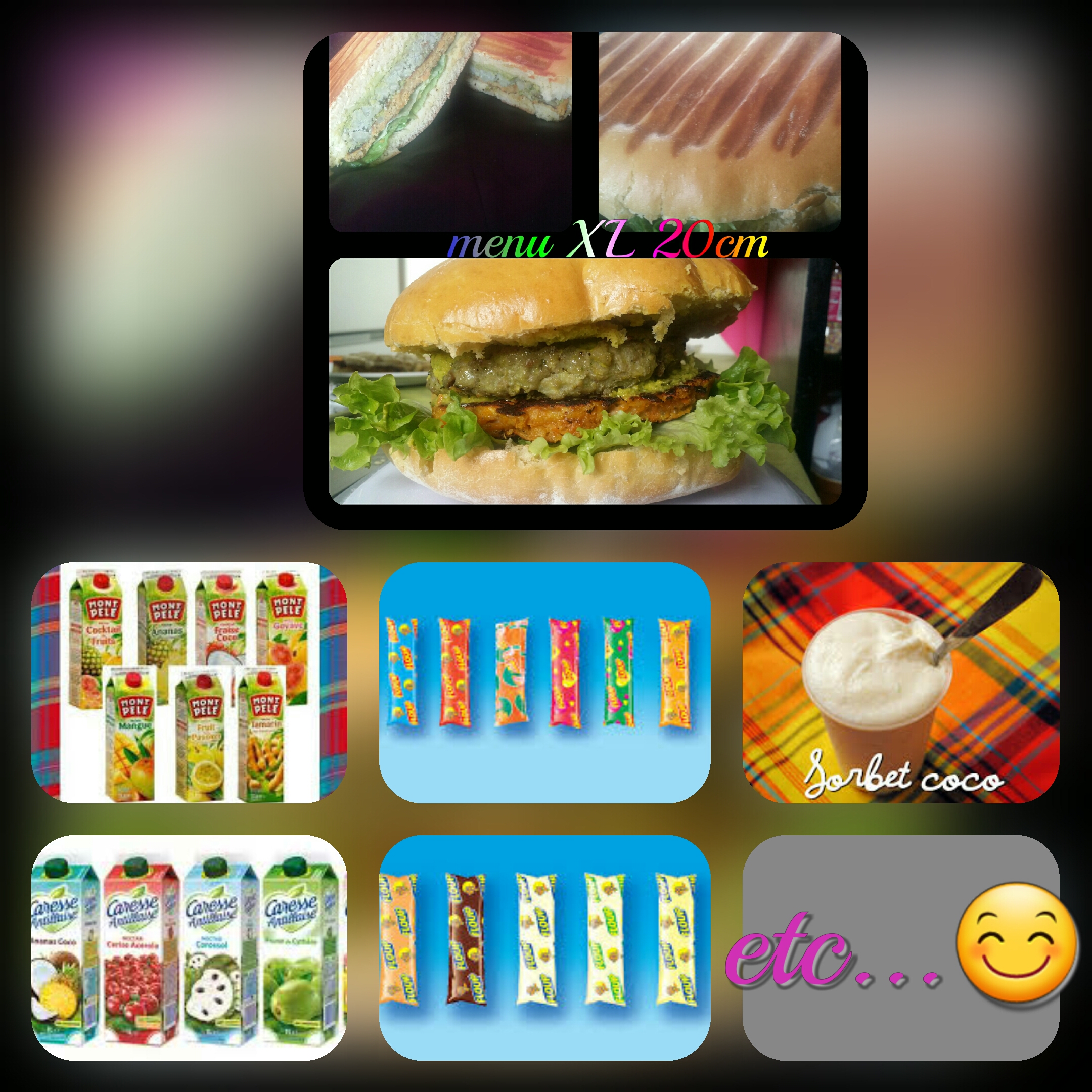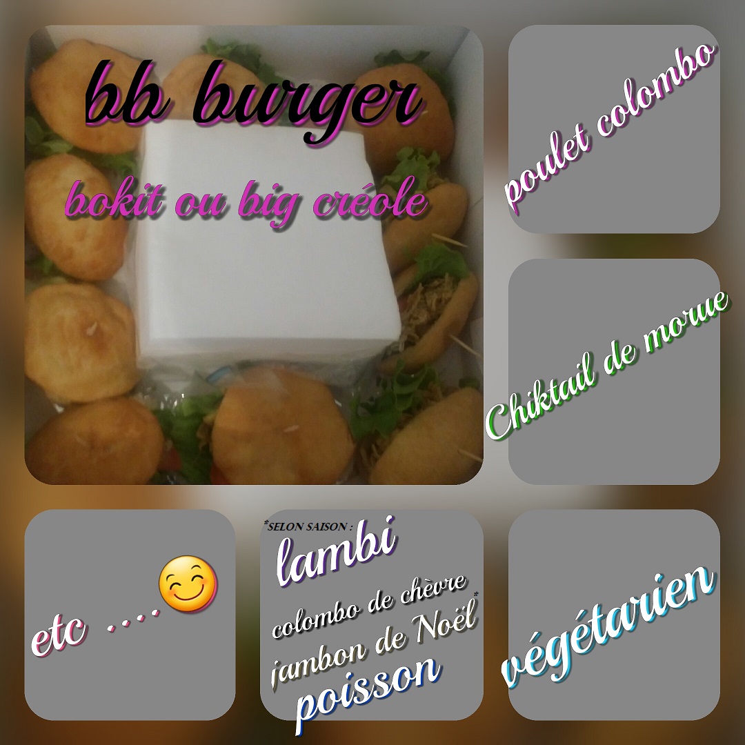 Je veux vous offrir le meilleur des Antilles! Des burgers créoles fait maison : tailles pouvant aller jusqu'à 20 cm de diamètre et plus ! (les sauces servis à part évidemment). Des boissons exotiques à découvrir ou à redécouvrir.