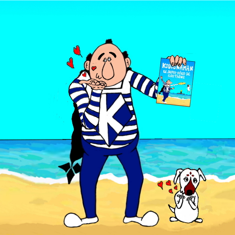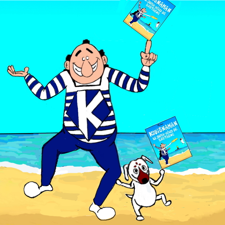 Parti d'un simple jeu de mot - "Kouignaman, le super-héros de Bretagne" - j'ai imaginé un personnage emblématique de la région, vêtu d'une marinière et d'une cape en forme d'hermine.