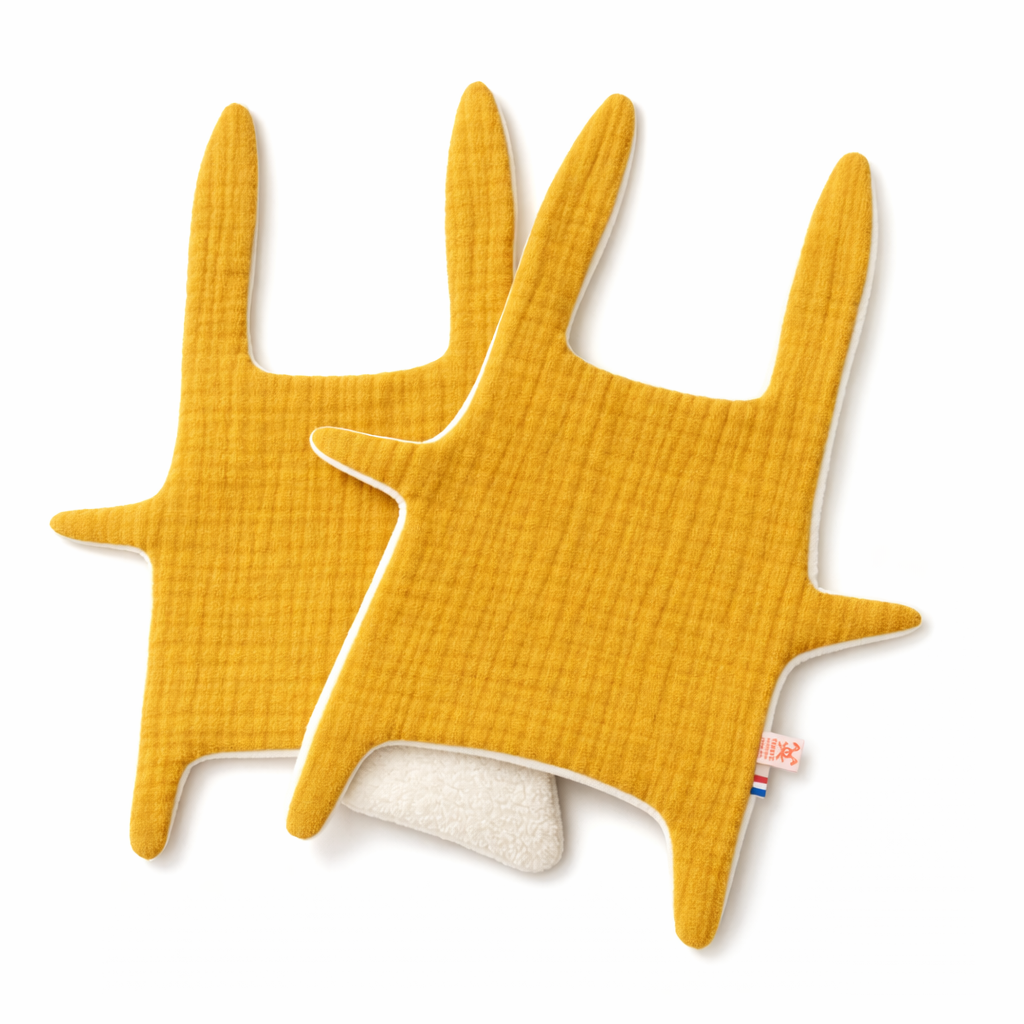 La création de doudous plats en coton biologique, fabriqués en Bretagne, pensés pour accompagner les bébés dès leurs premiers jours.