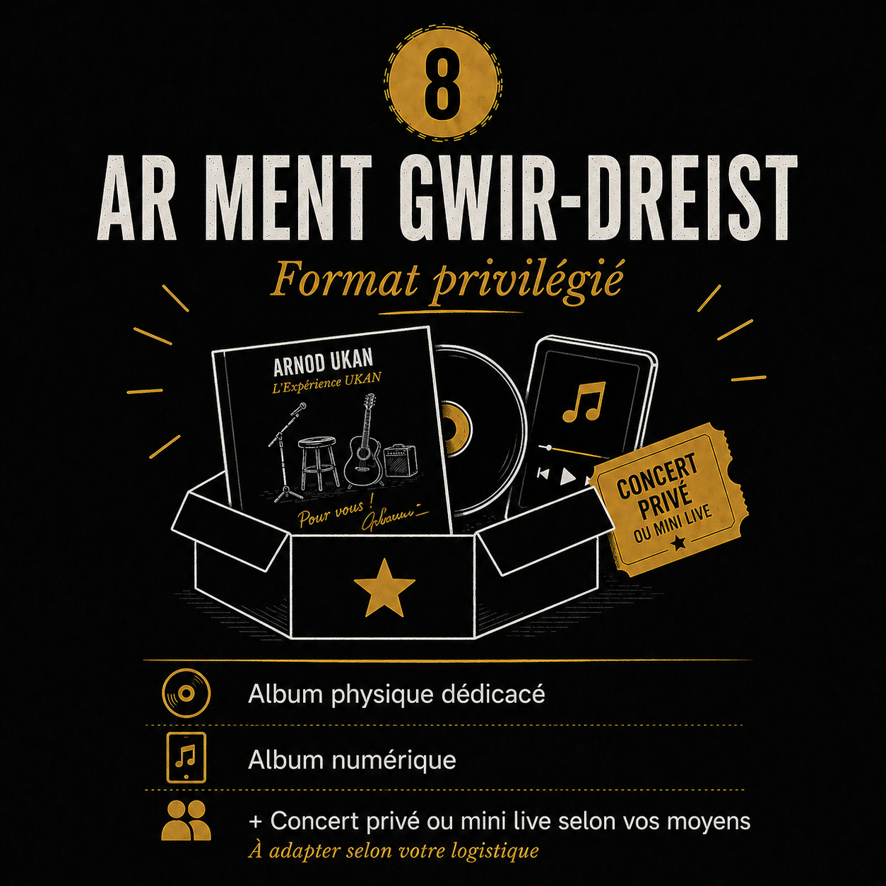 J'ai réalisé un premier EP auto-produit (5 titres) en 2017 ainsi qu'un premier clip, puis un deuxième EP ("Ar spi" en 2022), également auto-produit. Aujourd'hui, je veux réaliser "Adc'hanedigezh" ("Renaissance"), mon premier album en long format (10 titres, environ 45 minutes) et j'ai donc besoin de vous: famille, proches, ami-es, public, et de toutes celles et ceux qui veulent faire vivre la langue bretonne et la musique vivante.